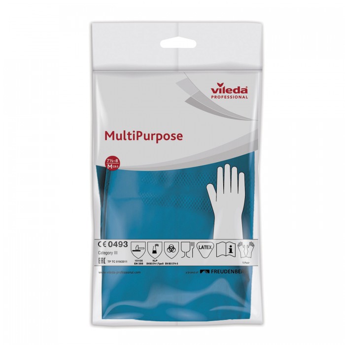 Перчатки МНОГОРАЗОВЫЕ резиновые VILEDA многоцелевые, хлопчатобумажное напыление, ПРОЧНЫЕ, размер M (средний), синий, вес 63 г, 174353