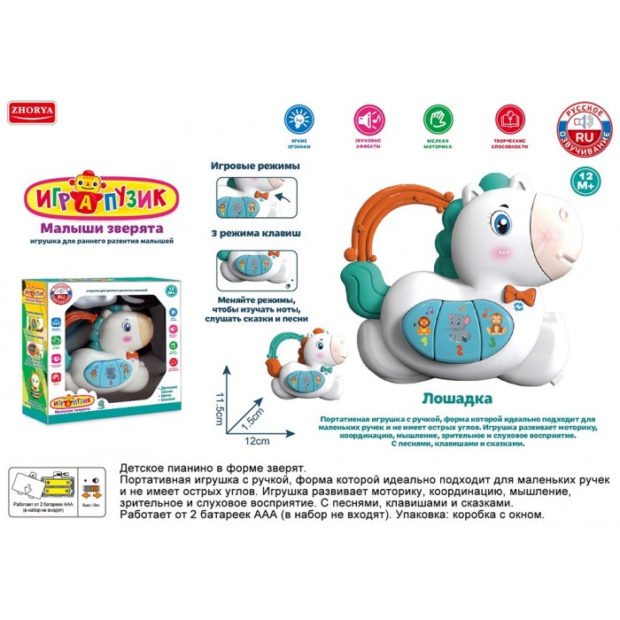 Размер упаковки: 16,1 х 5,5 х 7 см Размер изделия: 11,5 х 1,5 х 12 см Функционал: игрушка для малышей Вид упаковки: пакет, картонная коробка открытого типа Страна производитель: КНР Материал: полимеры Комплектация: игрушка - 1 шт Возраст ребенка: для детей от 12 месяцев Портативная игрушка с ручкой, форма которой идеално подходит для маленьких ручек и не имеет острых углов. Особенности: - световые и звуковые эффекты - русское озвучивание - игровые режимы - меняйте режимы, чтобы изучать ноты и слушать песенки - яркие огоньки - работает от 2-х батареек ААА 1.5V (не входят в набор)