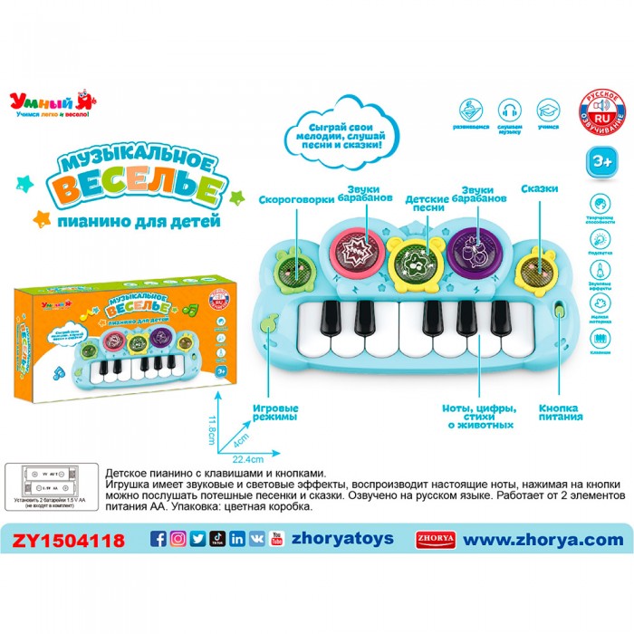 Размер упаковки: 22,4*4*11,8 см Функционал: музыкальный инструмент Упаковка: картонная коробка Питание: 2 батарейки АА (не в комплекте) Страна обладатель бренда: Китай Материал: пластик, металл Комплектация: пианино - 1 шт. Возраст ребенка: от 1 года Детское пианино - отличный способ привить малышу любовь к музыке. Пианино выполнено в ярком дизайне. Функции: скороговорки, звуки барабанов, ноты и цифры, стии о животных, песни и сказки. Имеются световые эффекты. Ребенок будет развивать слуховое восприятие, чувство ритма и такта, а также моторику рук, воображение и творческие способности. Игрушка познакомит ребенка с музыкальной грамотой, позволит воспроизводить известные произведения, а также создавать собственные.