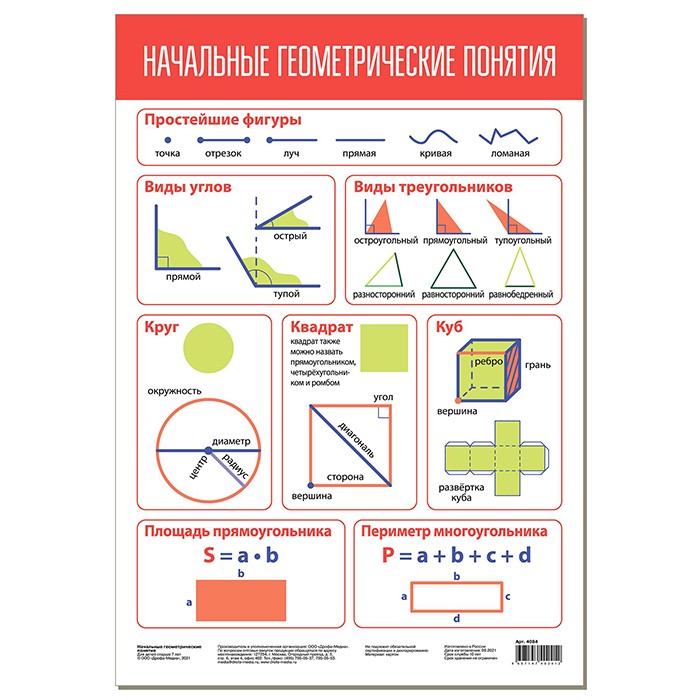 Размер упаковки: 29 х 42 х 0,3 см Формат: А3 Страна производитель: Россия Материал: картон Комплектация: плакат «Начальные геометрические понятия» - 1 шт. Вес: 43 гр. Возраст: 7+ Плакат «Начальные геометрические понятия» можно использовать на уроках математики или арифметики в начальных классах. На плакате представлены простейшие фигуры (круг, квадрат, куб), виды углов и треугольников. Приведены формулы, позволяющие определить площадь и периметр прямоугольника. Данный плакат можно повесить в зоне видимости, где занимается ребёнок, а также и использовать его в школе.