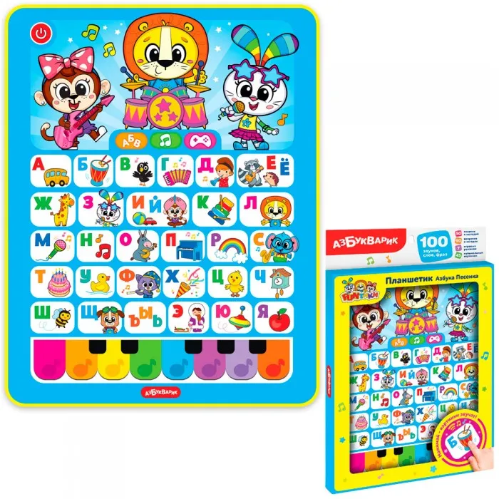 Размер упаковки: 19,2*29,5*1,6 см Размер изделия: 18,9*24,2*1,4 см Функционал: музыкальная игрушка Упаковка: картонная коробка с подвесом Страна обладатель бренда: Россия Материал: пластик Комплектация: планшет - 1 шт. Возраст ребенка: от 3 лет Оригинальная музыкальная игрушка предназначена для активных игр и развития мелкой моторики и координации движений. Яркая расцветка развлечет малыша и привлечет его внимание. Планшет оснащен кнопками, нажимая на которые малыш сможет услышать различные звуки и мелодии, а еще познакомиться с буквами русского алфавита. Учить буквы можно в двух режимах: «Буквы» и «Звуки». А еще планшет содержит новые хиты про друзей Фантиков, и познавательные песенки-загадки, и танцевальные мелодии – всего 50 песенок и мелодий. 90 вопросов и загадок в 3-х играх помогут малышу проверить знания и весело провести время. В игре «Волшебное пианино» ребенок сможет сам сыграть 10 популярных мелодий («Каравай», «Песенка про кузнечика», «Чижик-пыжик», «Два весёл