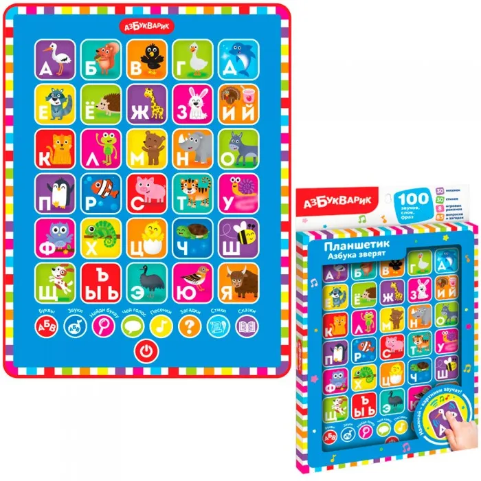 Размер упаковки: 18,9*29*1,6 см Размер изделия: 18,5*24*1,5 см Функционал: музыкальная игрушка Упаковка: картонная коробка с подвесом Страна обладатель бренда: Россия Материал: пластик Комплектация: планшет - 1 шт. Возраст ребенка: от 3 лет Оригинальная музыкальная игрушка предназначена для активных игр и развития мелкой моторики и координации движений. Яркая расцветка развлечет малыша и привлечет его внимание. Планшет оснащен кнопками, нажимая на которые малыш сможет услышать различные звуки и мелодии, а еще познакомиться с буквами русского алфавита. 8 игровых режимов: «Буквы», «Звуки», «Найди букву», «Чей голос», «Песенки», «Загадки», «Стихи», «Сказки». 30 стихов (азбука в стихах) помогут лучше запомнить буквы, а 85 вопросов и загадок – проверить знания. После занятий ребенок может отдохнуть и послушать 30 песенок о зверятах и 3 сказки («Заяц и черепаха», «Лягушка-путешественница», «Тигрёнок»). Игрушка учит пониманию причинно-следственной связи, помогает тренировать мотор