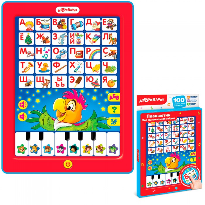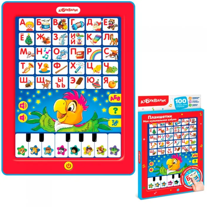 Размер упаковки: 29*18,8*1,8 см Размер изделия: 24*18,5 см Функционал: игровой развивающий планшет, обучающие функции, музыкальные эффекты, 100 звуков, слов и вопросов, 42 говорящие картинки, 40 песен, 3 игровых режима Упаковка: картонная коробка с дисплеем и подвесом Страна обладатель бренда: Россия Материал: пластик Комплектация: планшет - 1 шт. Возраст ребенка: от 3 лет Планшет представляет собой наглядное пособие для детей. Он содержит веселые мелодии, обучающие функции, яркие картинки. Проигрывает звуки, слова, веселые песенки и мелодии («Танцуй-танцуй», «Чунга-чанга», «Песенка Мамонтёнка», «Котёнок-веселушка», «Облака», «Фантазёры», «Антошка», «Калинка», «Весёлая карусель» и т.д.). Функция пианино. 2 игры: «Угадай букву» и «Угадай мелодию». Тип батарейки: 3 х ААА (в комплекте демонстрационные). Красочное и функциональное изделие содержит кнопки, нажав на которые можно услышать звуки, мелодии, информацию. Планшет наглядно демонстрирует материал. Развивает память и