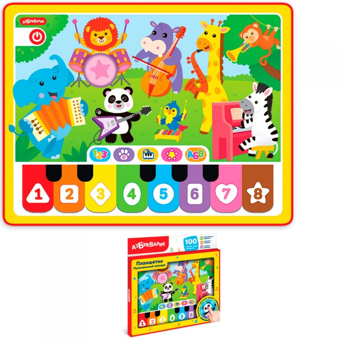 Размер упаковки: 24,3*23,6*1,6 см Размер изделия: 24*18,5 см Функционал: игровой развивающий планшет, обучающие функции, музыкальные эффекты, 100 звуков, слов и вопросов, 30 музыкальных картинок, 35 песен и мелодий, 10 игровых режимов Упаковка: картонная коробка с дисплеем и подвесом Страна обладатель бренда: Россия Материал: пластик Комплектация: планшет - 1 шт. Возраст ребенка: от 3 лет Планшет представляет собой наглядное пособие для детей. Он содержит веселые мелодии, обучающие функции, яркие картинки. Проигрывает песенки про музыкальные инструменты и детские хиты («Бум-Бум», «Как чудесно жить на свете», «Чунга-чанга», «Начнем вечеринку», «Где-то в жаркой Африке», «Топ-топ-топ», «Арам зам зам», «Всем вокруг нужны друзья»). На отдельной кнопочке также записаны 5 обучающих песенок про буквы, цифры, формы, цвета и противоположности. Функция пианино. Содержит три игры: «Угадай звук», «Веселые знания», «Загадки». Тип батарейки: 3 х ААА (в комплекте демонстрационные). Кра