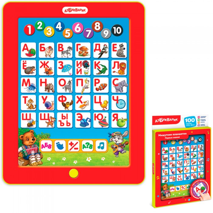 Размер упаковки: 18,9*29*1,6 см Размер изделия: 18,5*24*1,5 см Функционал: музыкальная игрушка, обучающие функции - азбука, сказочные герои Упаковка: картонная коробка с дисплеем и подвесом, 100 звуков, слов, фраз, 48 говорящих картинок, 15 песенок, 5 игровых режимов, 90 вопросов и загадок Страна обладатель бренда: Россия Материал: пластик Комплектация: планшет - 1 шт. Возраст ребенка: от 3 лет Оригинальная музыкальная игрушка предназначена для активных игр и развития мелкой моторики и координации движений. Проигрывает 5 обучающих песенок («Учим буквы и поём», «Мы научимся считать», «Цвета радуги», «Весёлые противоположности», «Времена года») и 10 веселых песенок и потешек («Мишка косолапый», «Три медведя», «Топ-топ», «Теремок», «Как чудесно жить на свете!», «Заинька, попляши!», «Заюшкина избушка», «Танец зверят», «Колобок», «Зарядка»). Яркая расцветка развлечет малыша и привлечет его внимание. Планшет оснащен кнопками, нажимая на которые малыш сможет услышать различные звуки и мел