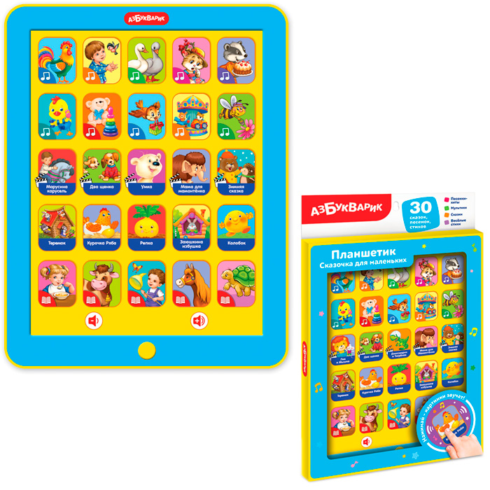 Размер упаковки: 19,2 х 29,3 х 1,8 см Размер изделия: 24 х 18,5 х 1 см Упаковка: Картонка с блистером с окошком Вес: 220 г Функционал: Электронная музыкальная игрушка из пластмассы Вид: игровой планшетик Страна обладатель бренда: Китай Материал: пластик, металл Комплектация: планшетик 1 шт, батарейки 3ААА (в комплекте демонстрационные) Возраст ребенка: рекомендовано детям с 3-6 лет. Бестселлер Азбукварика обучающий планшет «Сказочка для самых маленьких» станет прекрасным вложением в будущие интеллектуальные способности ребёнка: - В нем собраны любимые потешки, веселые детские песенки, русские народные сказки, стихи о ребятах и зверятах, добрые мультики. - Планшет способствует расширению кругозора и развитию слуха, памяти, мелкой моторики, речи и фантазии. Работает от 3-х батареек типа АА (в комплекте). Рекомендовано детям от 3 лет. - Бонус - QR-код для скачивания 20 интерактивных загадок о животных в мобильном приложении "Азбукварик.