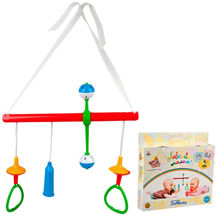 Размер в упаковке-5 × 27 × 26 см Вес0.21 кг Подвеска Ловкий малыш является не просто развивающей игрушкой, но и своеобразным тренажером. На специальной полочке подвешены разные погремушки-хваталки, за которые можно держаться и учиться самостоятельно вставать. Малышу обязательно понравится яркая подвеска на кроватку. Малыш будет пытаться дотянуться до нее, потрогать, понять откуда идет звук. Игрушка развивает моторику, слух, зрение.Все погремушки закреплены на пластиковой полочке длиной 31 см, которая крепится к кроватке при помощи веревок.