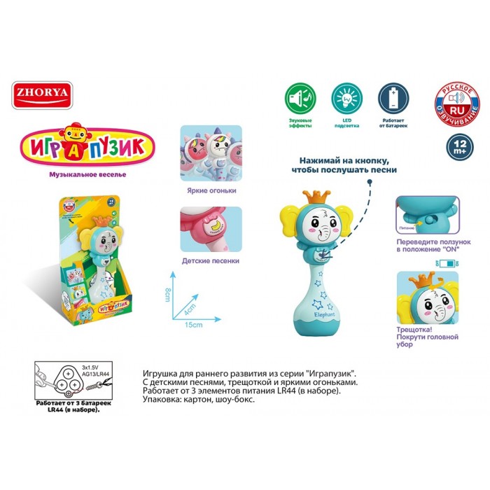 Размер упаковки: 16 х 5,5 х 20 см Размер изделия: 8 х 4 х 15 см Функционал: игрушка для малышей Вид упаковки: пакет, картонная коробка открытого типа Страна производитель: КНР Материал: полимеры Комплектация: игрушка - 1 шт Возраст ребенка: для детей от 12 месяцев Игрушка для раннего развития малыша обязательно понравится детям и родителям. Особенности: - световые и звуковые эффекты - русское озвучивание - если покрутит головной убор можно услышать звуки трещотки - яркие огоньки - детские песенки - работает от 3-х батареек LR44 (в наборе)