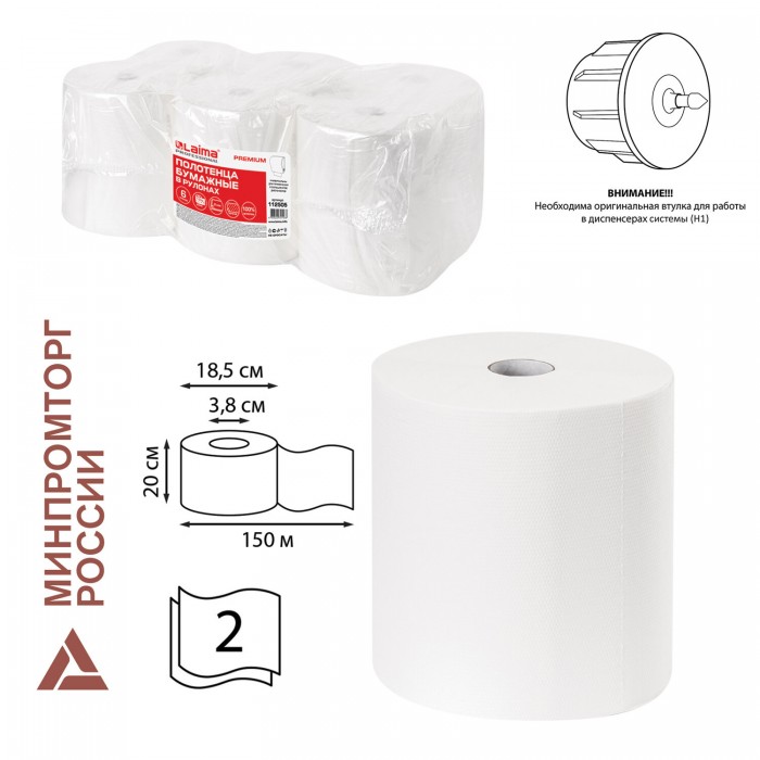 Бумажные полотенца в рулонах LAIMA PREMIUM. Подходят к диспенсерным системам H1 ПРИ ИСПОЛЬЗОВАНИИ ОРИГИНАЛЬНЫХ ВТУЛОК от расходных материалов H1.