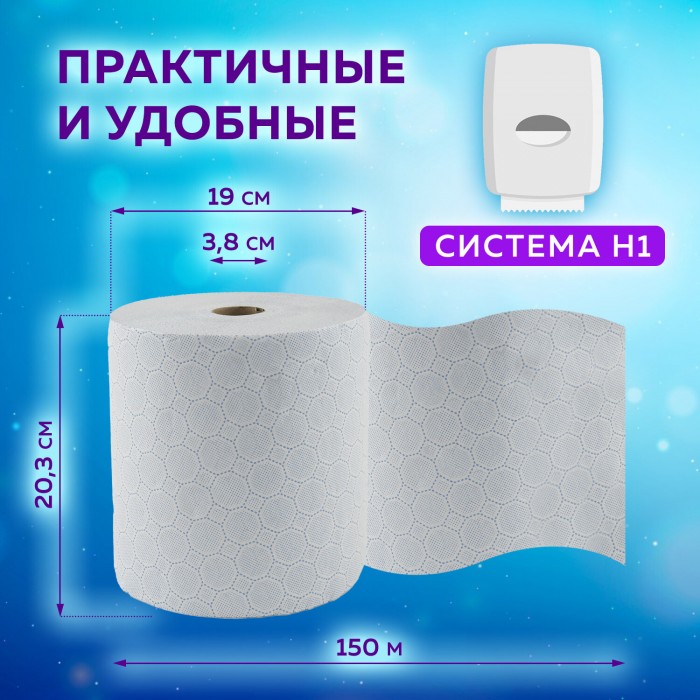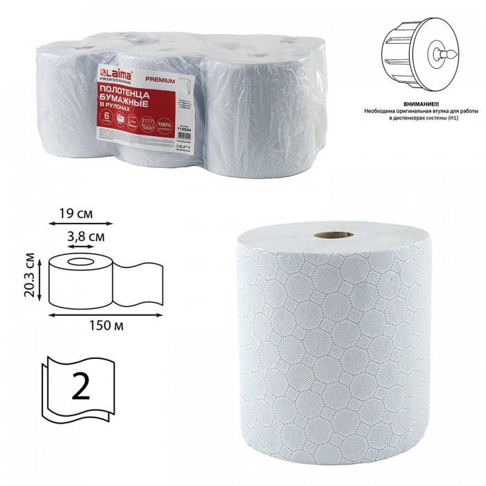 Полотенца бумажные рулонные 150 м, LAIMA (Система H1) PREMIUM, 2-слойные, белые с ЦВЕТНЫМ ТИСНЕНИЕМ, КОМПЛЕКТ 6 рулонов, 112504
