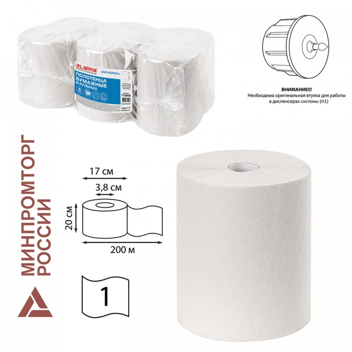 Бумажные полотенца в рулонах LAIMA UNIVERSALПодходят к диспенсерным системам H1 ПРИ ИСПОЛЬЗОВАНИИ ОРИГИНАЛЬНЫХ ВТУЛОК от расходных материалов H1.