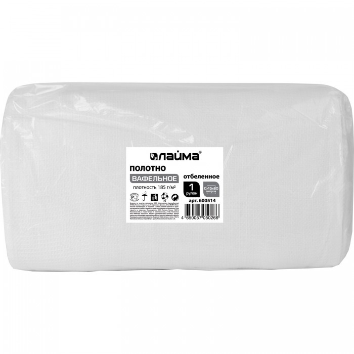 Полотно ВАФЕЛЬНОЕ отбеленное, рулон 0,45х60 м, плотность 185 (±10) г/м2, LAIMA, 600514, ГС
