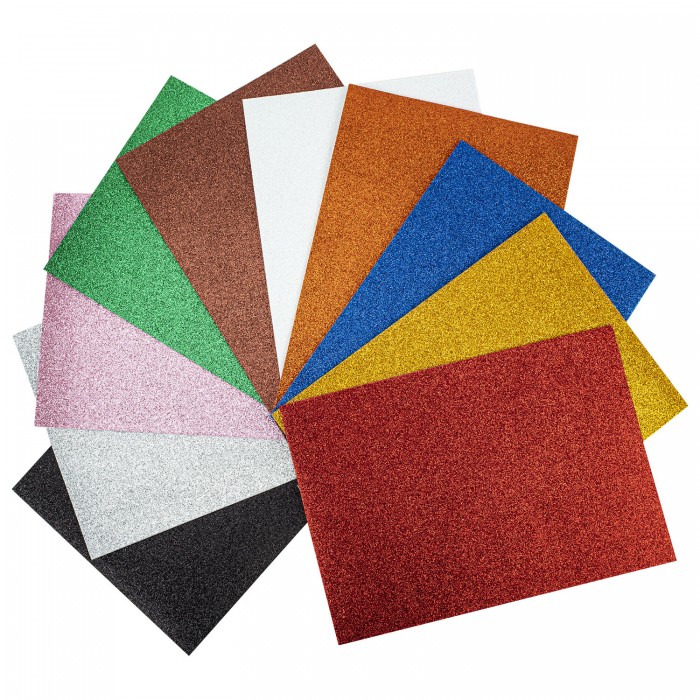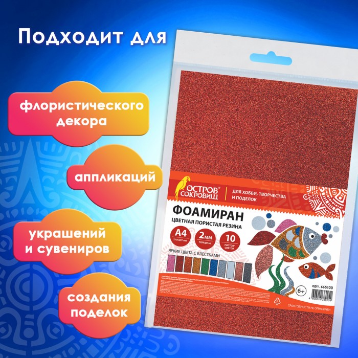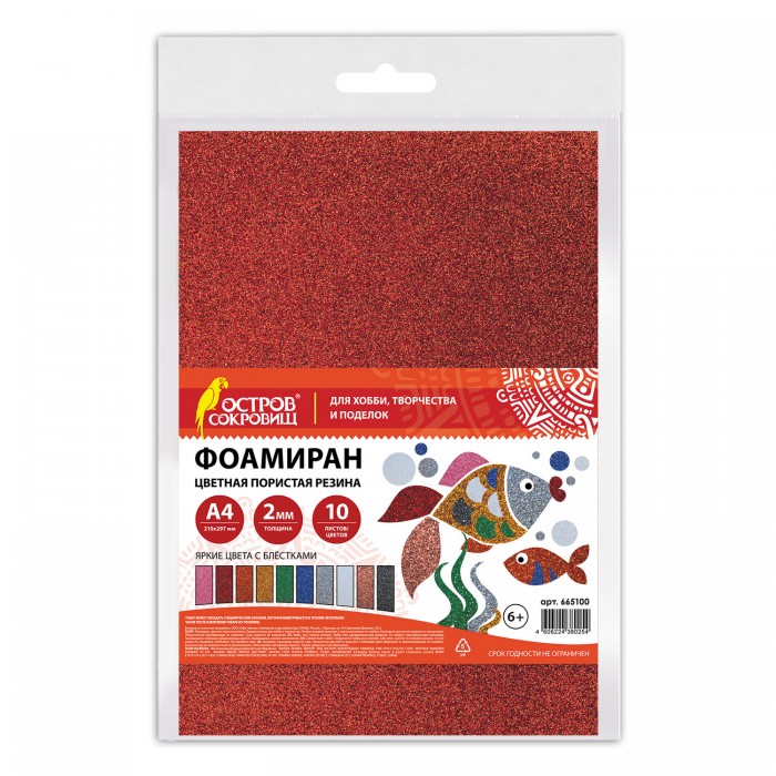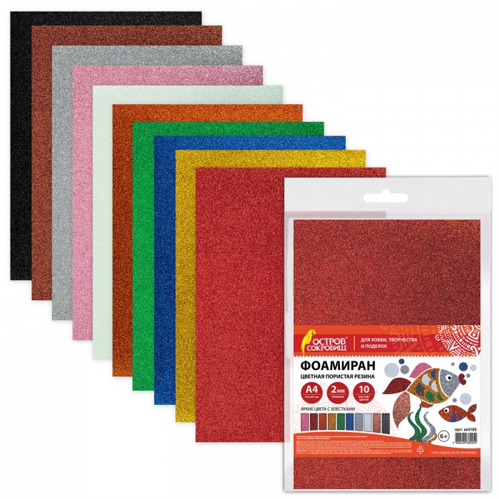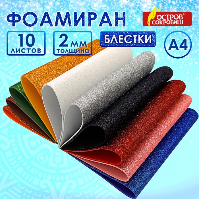 Пористая резина/фоамиран А4, 2 мм, 10 листов, 10 цветов, яркие цвета, блестки, ОСТРОВ СОКРОВИЩ, 665100