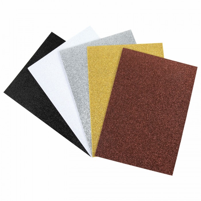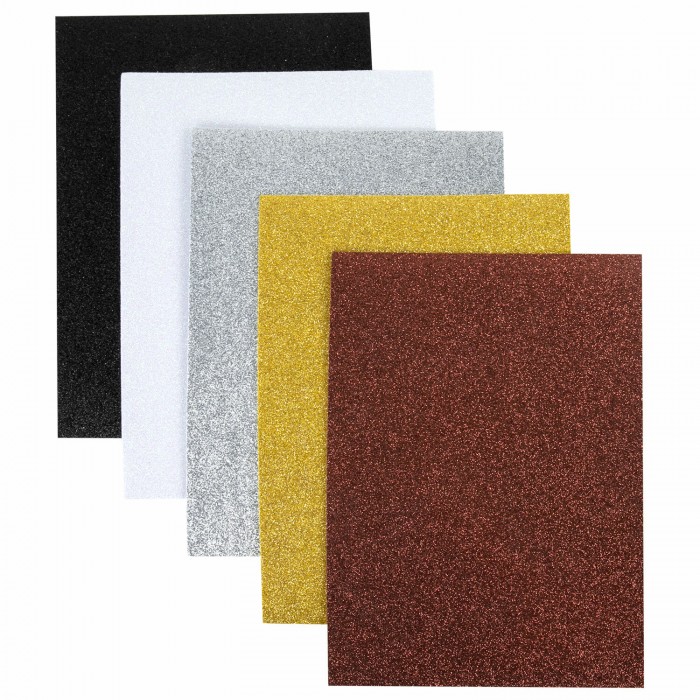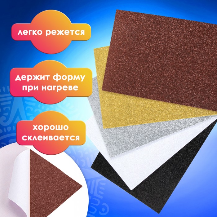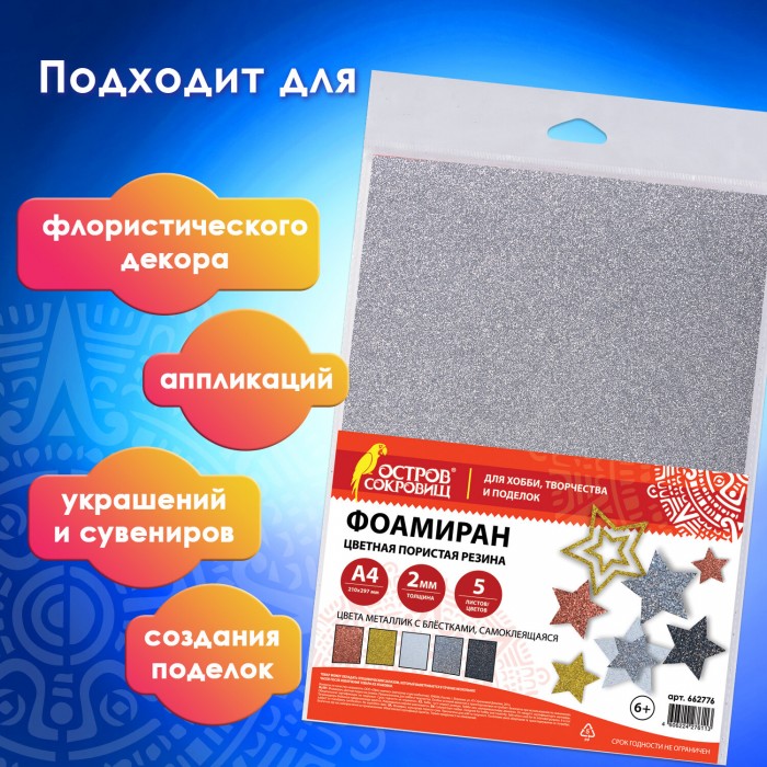 Пористая резина/фоамиран А4, 2 мм, 5 листов, 5 цветов, металлик, блестки, самоклеящаяся, ОСТРОВ СОКРОВИЩ, 662776