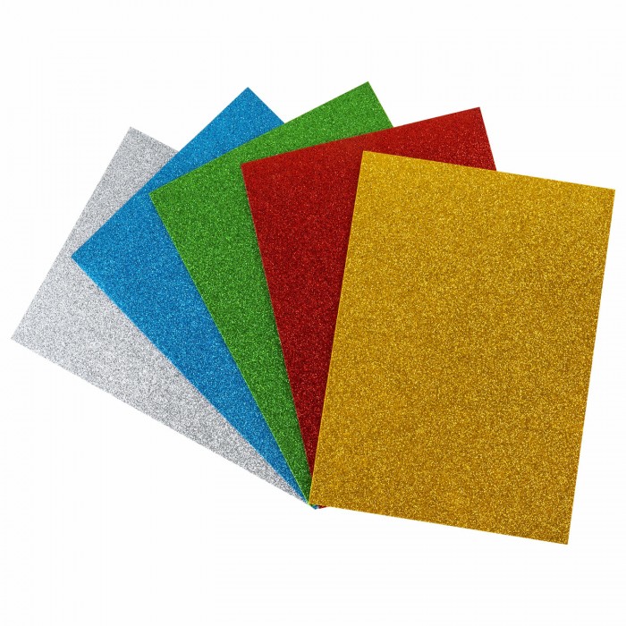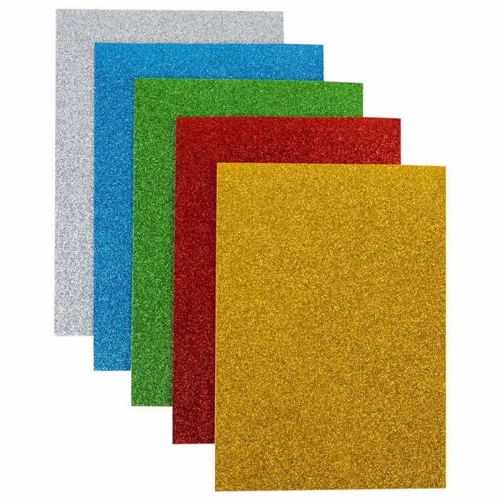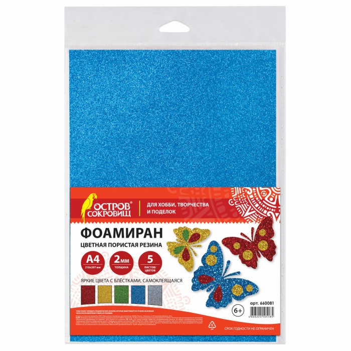 Пористая резина/фоамиран А4, 2 мм, 5 листов, 5 цветов, яркие цвета, блестки, самоклеящаяся, ОСТРОВ СОКРОВИЩ, 660081