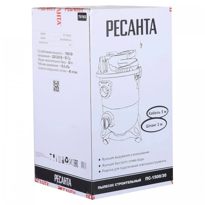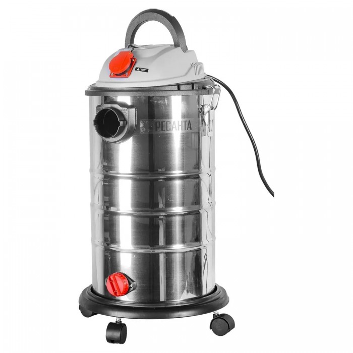 Пылесос хозяйственный РЕСАНТА ПС-1500/30, 1500 Вт, сухая/влажная уборка, сила всасывания 300 Вт, бак 30 л, 75/19/2