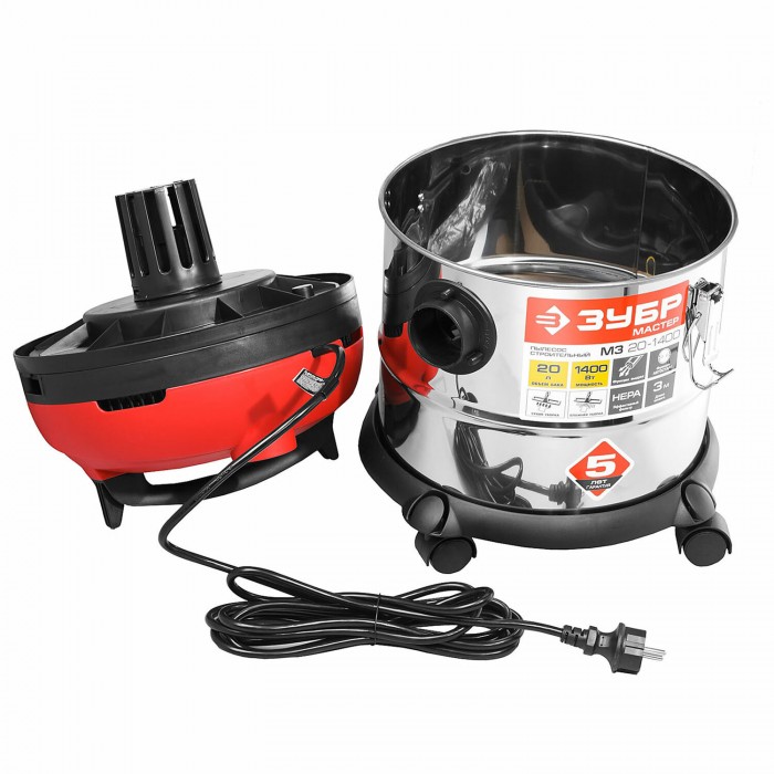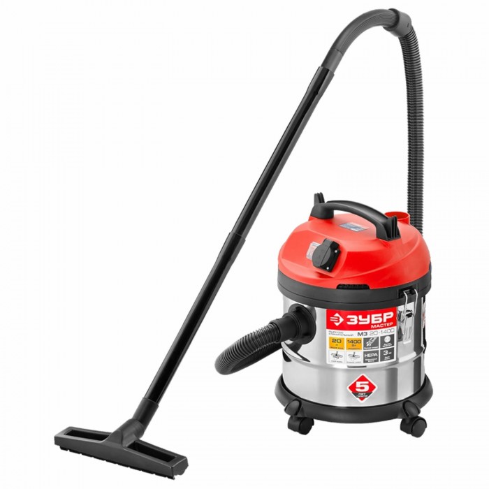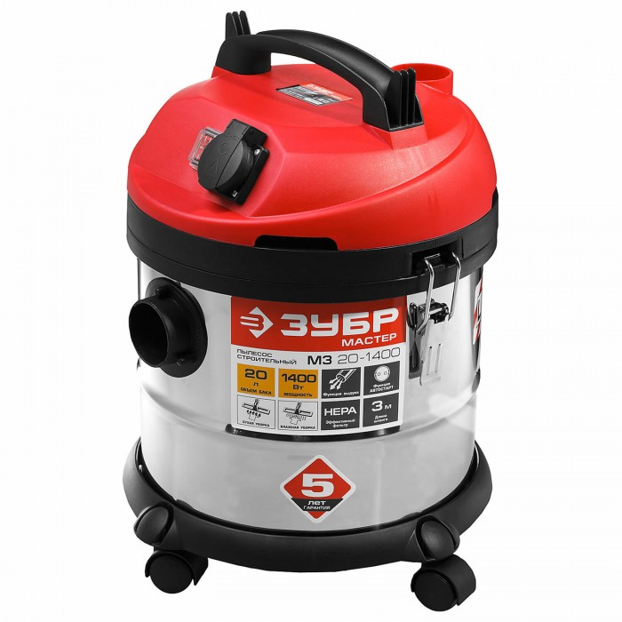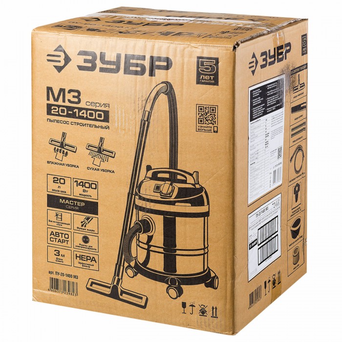 Пылесос хозяйственный ЗУБР ПУ-20-1400, 1400 Вт, сухая/влажная уборка, сила всасывания 300 Вт, бак 20 л, ПУ-20-1400 М3