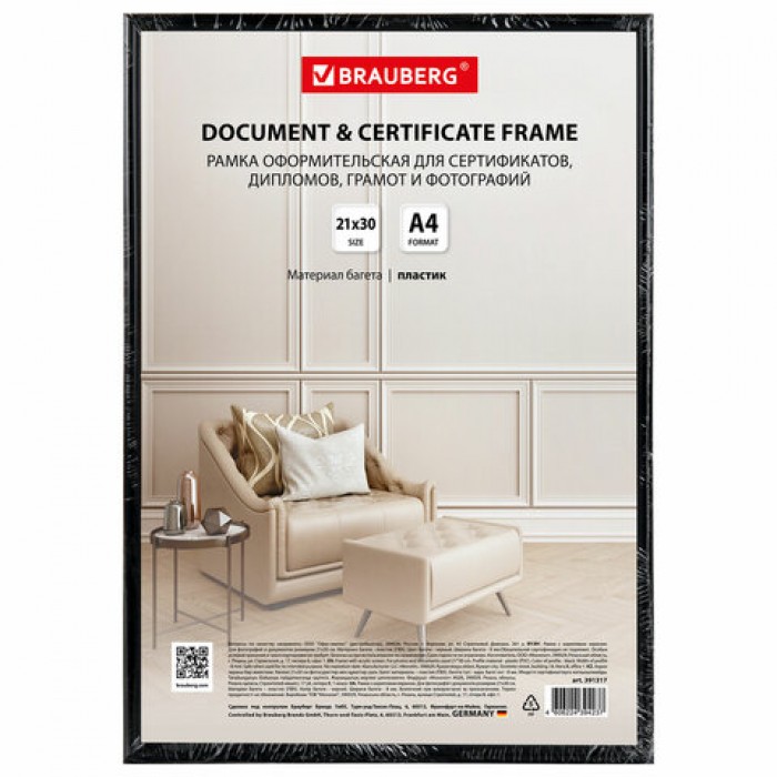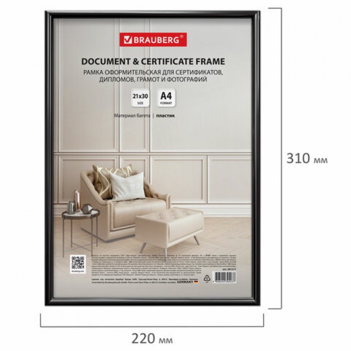 Рамка BRAUBERG "Slim" для фотографий, дипломов, сертификатов, грамот и других ценных документов гармонично будет смотреться как в офисном, так и в домашнем интерьере, а также в салонах и предприятиях, в магазинах и различных учреждениях.