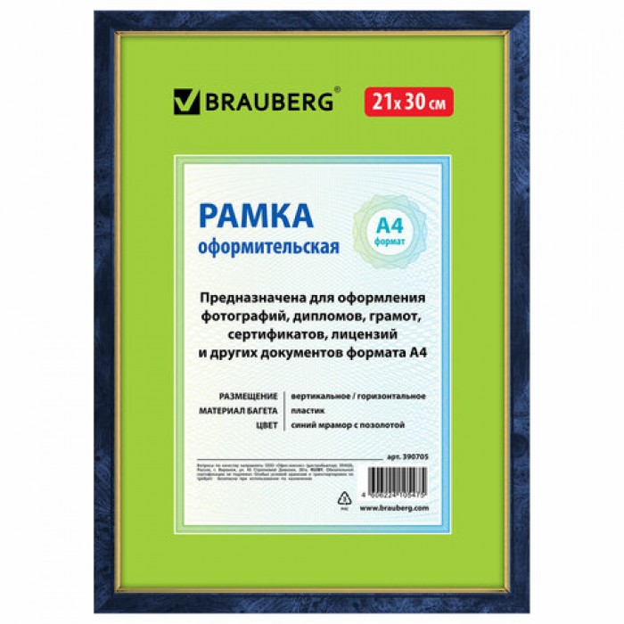 Рамка BRAUBERG "HIT" для оформления фотографий, дипломов, сертификатов, грамот, лицензий и других документов формата А4 (21х30 см) будет гармонично смотреться в любом интерьере - дома и офисе, учебных учреждениях и магазинах, салонах и предприятий и др.