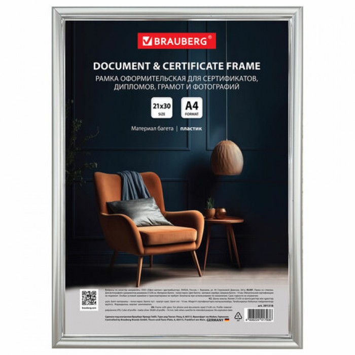 Рамка BRAUBERG "HIT2" для оформления фотографий, дипломов, сертификатов, грамот, лицензий и других документов формата А4 (21х30 см) будет гармонично смотреться в любом интерьере - дома, в офисе, в учебных учреждениях и магазинах, в салонах и т.д.