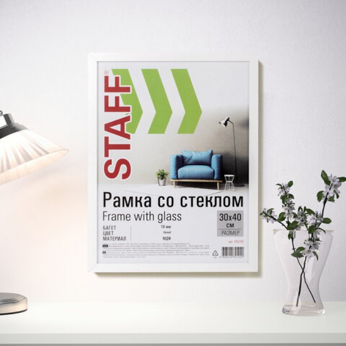 Рамка 30х40 см, белая STAFF "Grand", багет 18 мм, стекло, МДФ, 391195