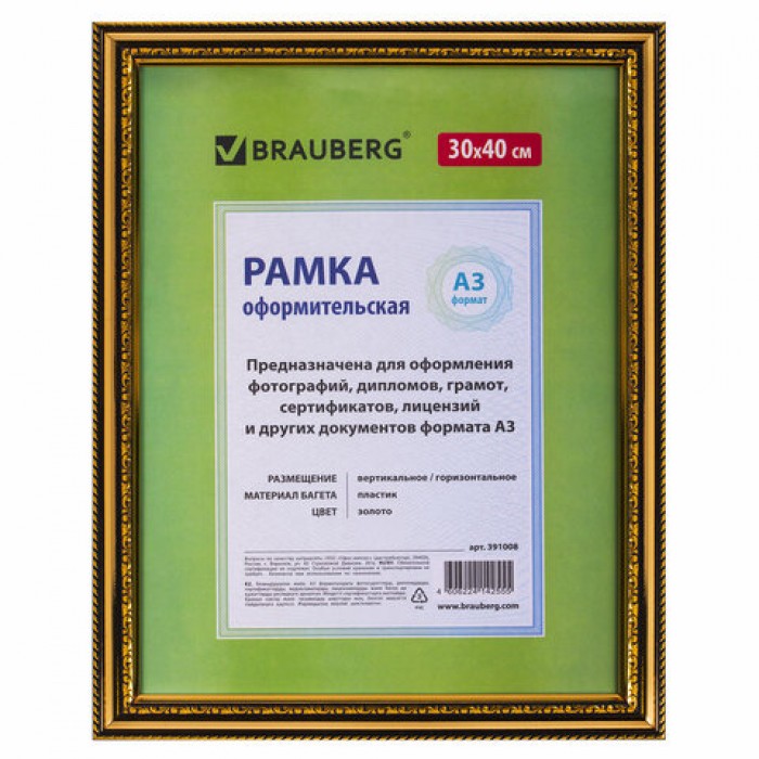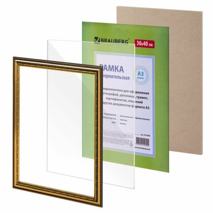 Рамка BRAUBERG "HIT4" для оформления фотографий, дипломов, сертификатов, грамот, лицензий и других документов формата А3 (30х40 см) будет гармонично смотреться в любом интерьере - дома и офисе, учебных учреждениях и магазинах, салонах и предприятий и др.