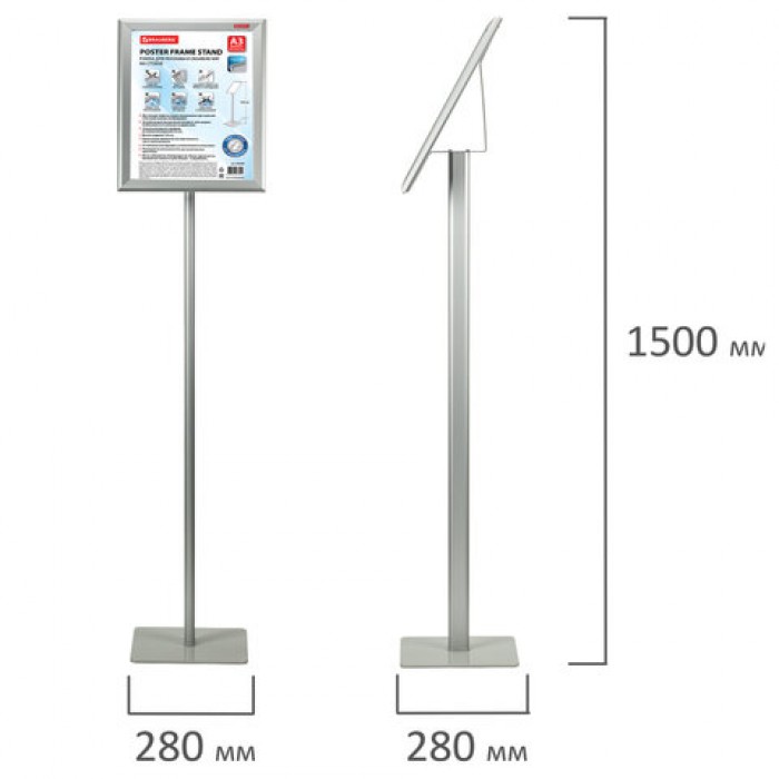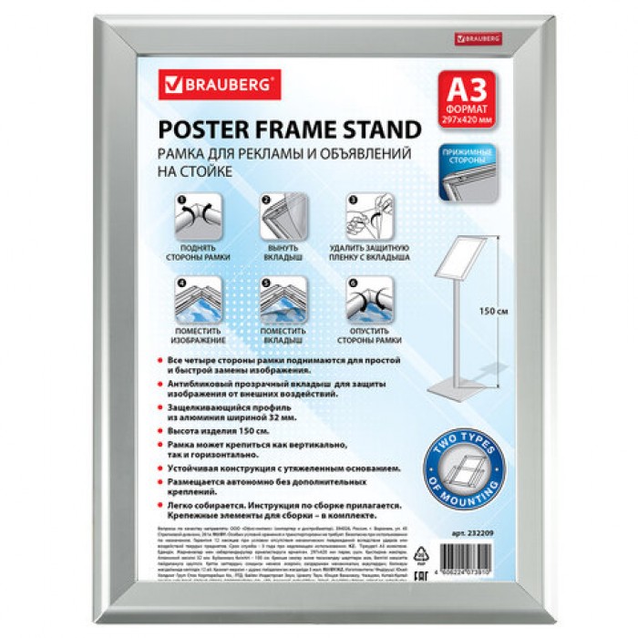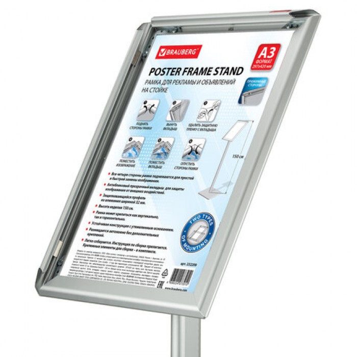 Рамка на стойке для рекламы БОЛЬШОГО ФОРМАТА (297х420 мм), А3, алюминиевая, прижимные стороны, BRAUBERG, 232209