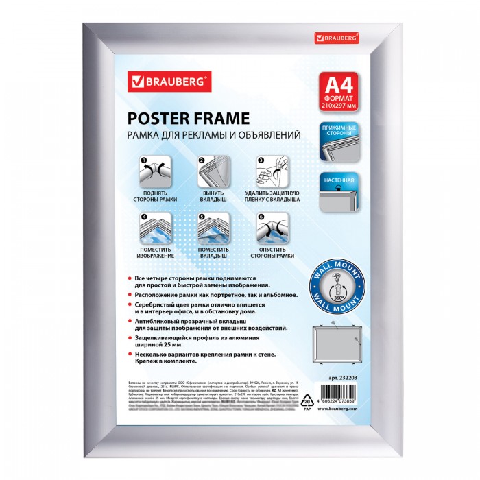 Настенная рамка BRAUBERG актуальна для рекламных носителей, объявлений и документов, требующих частой замены.