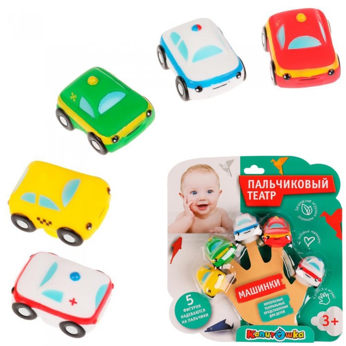 Размер упаковки: 23 х 18 х 4 см Вид упаковки: блистер на картонной подложке Страна производитель: КНР Материал: ПВХ Комплектация: 5 фигурок Возраст ребёнка: 3+ Пальчиковый театр «Машины» ТМ «Капитошка» понравится малышу и сделает купание ещё более весёлым. Особенности: - яркий дизайн; - 5 фигурок надеваются на пальчики; - безопасно для детей.