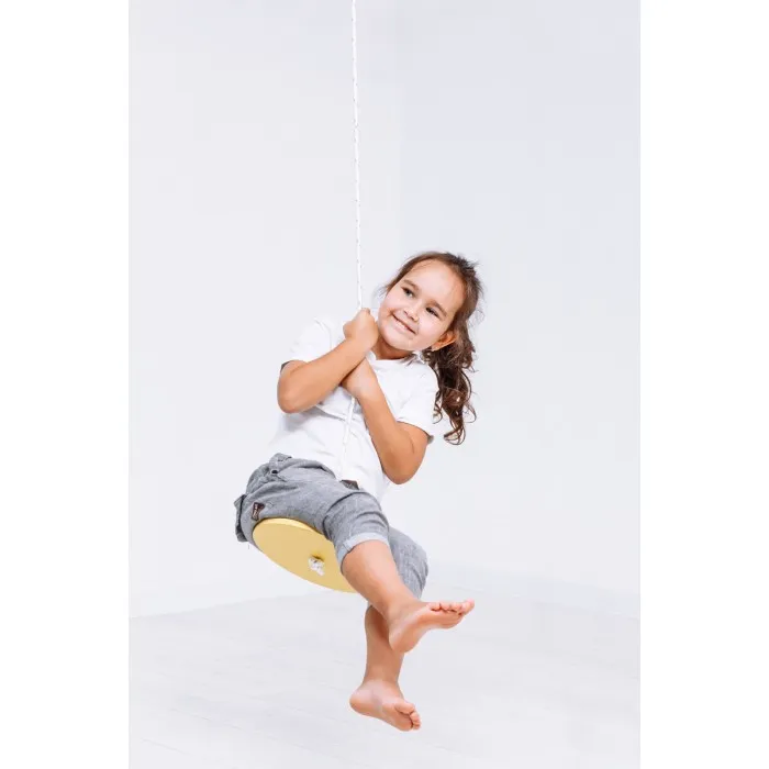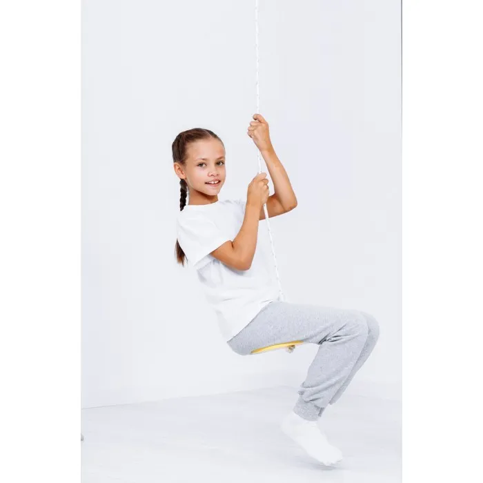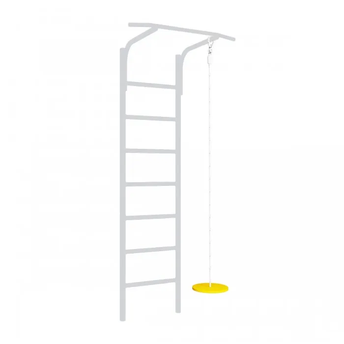 Полезное оборудование для тренировки ловкости, координации и вестибулярного аппарата — простой подвес с круглым деревянным сидением. Дети любят раскачиваться на нем, его можно повесить на любую перекладину спортивного комплекса ROMANA.