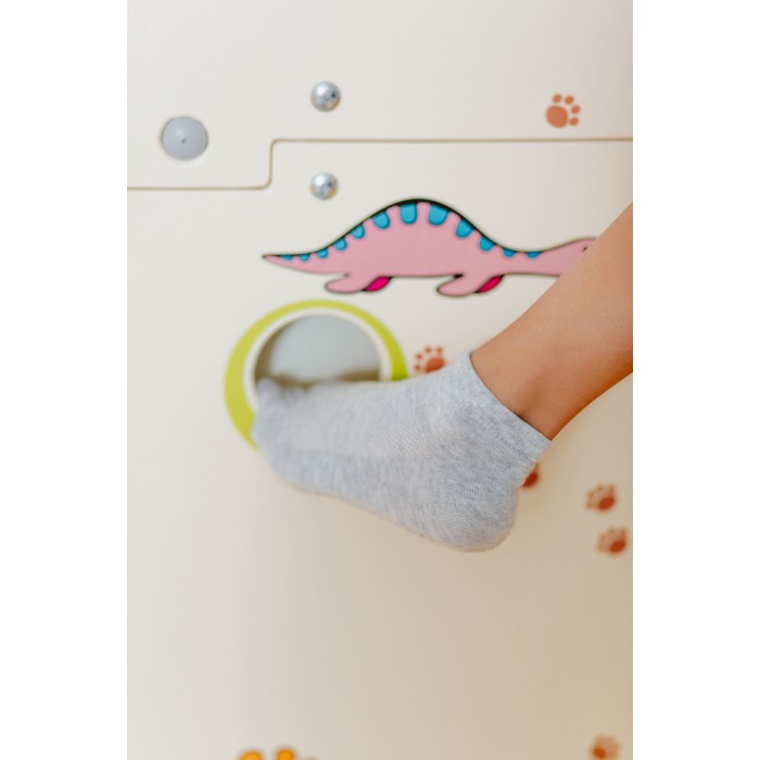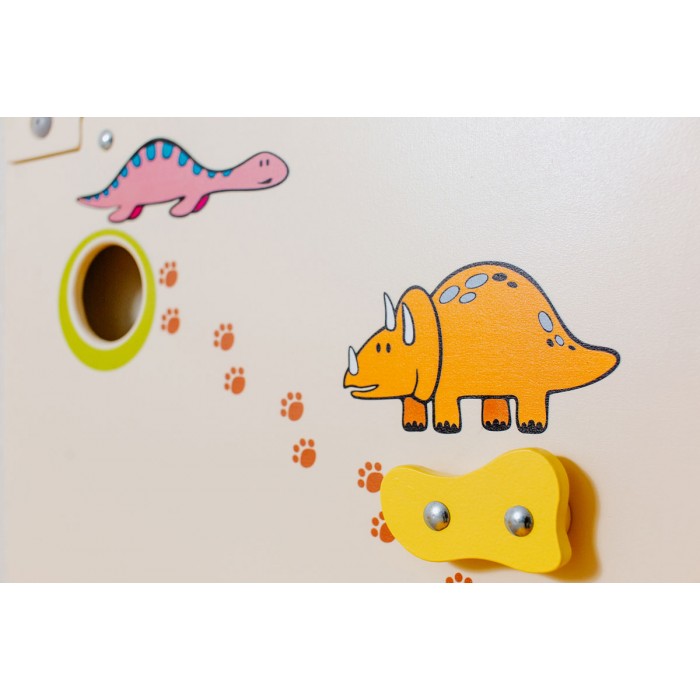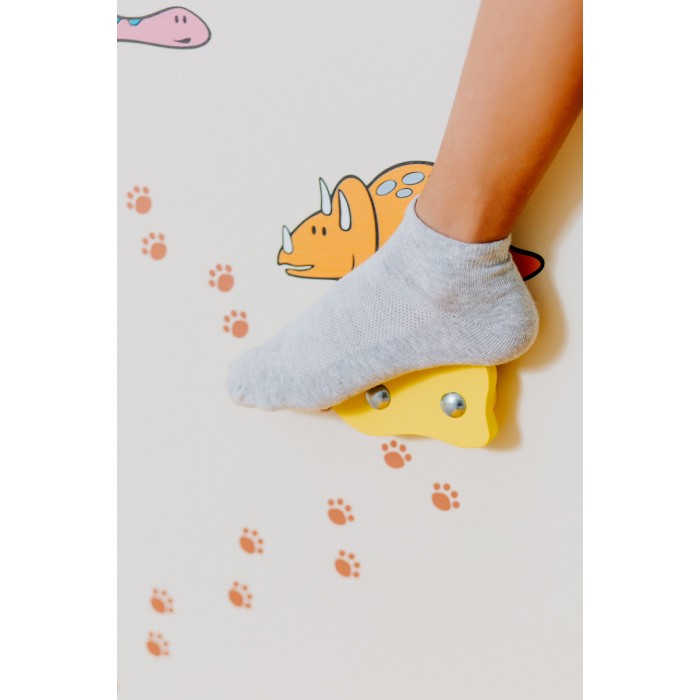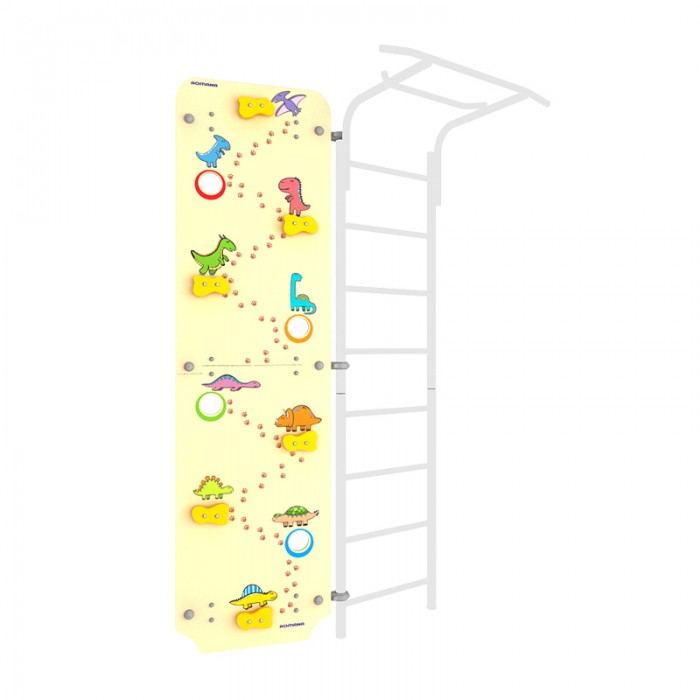 «Скалолаз» сделан из крепкой фанеры, все отверстия и зацепы расположены так, чтобы не создавать чрезмерных трудностей при вскарабкивании. Зацепы из фанеры удобны и безопасны. Чтобы было нескучно, оборудование украшено веселыми динозавриками.