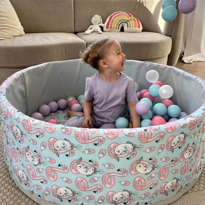 В комплект входит поролоновый напольный бассейн, съемный чехол из водонепроницаемой ткани Оксфорд с нежным принтом — фламинго и единорогами снаружи и на дне, 150 пластиковых шаров и сумка для хранения.