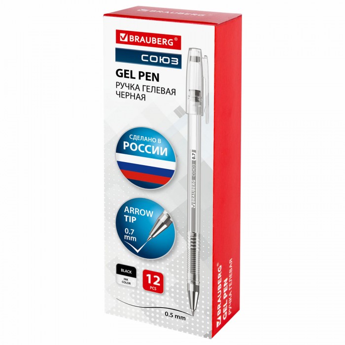 Ручка гелевая РОССИЯ "СОЮЗ", ЧЕРНАЯ, корпус прозрачный, 0,7 мм, линия письма 0,5 мм, BRAUBERG, 143963
