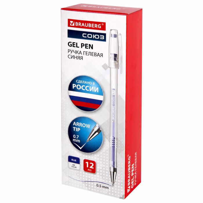 Ручка гелевая РОССИЯ "СОЮЗ", СИНЯЯ, корпус прозрачный, узел 0,7 мм, линия письма 0,5 мм, BRAUBERG, 143962