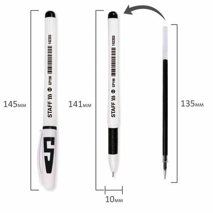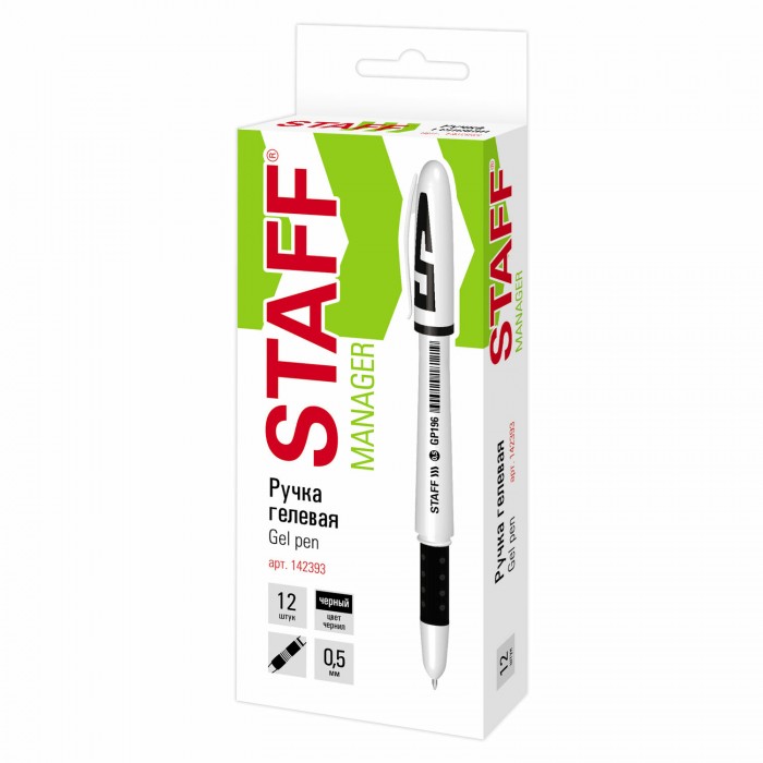 Ручка гелевая с грипом STAFF "Manager" GP-196, ЧЕРНАЯ, корпус белый, игольчатый узел 0,5 мм, линия письма 0,35 мм, 142393