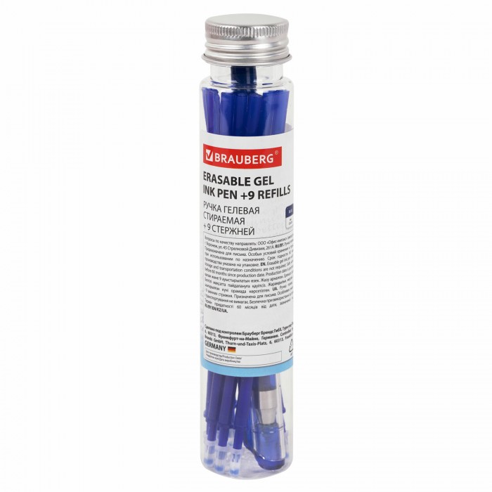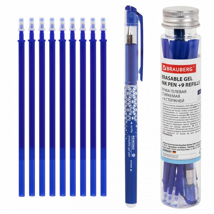 Ручка стираемая гелевая + 9 стержней в ПЛАСТИКОВОЙ ТУБЕ, СИНЯЯ, игольчатый наконечник 0,5 мм, линия 0,35 мм, BRAUBERG, 144093