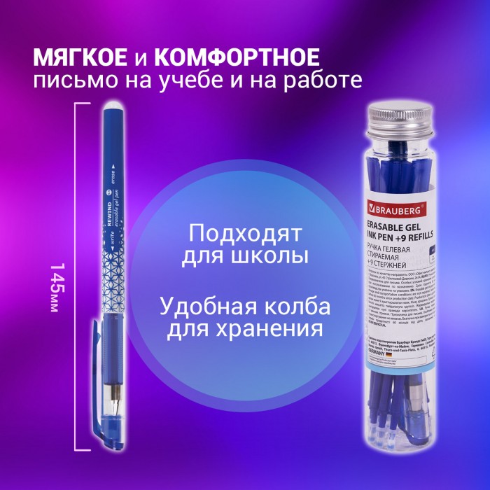 Стираемая гелевая ручка BRAUBERG в пластиковой тубе обладает уникальным сочетанием ярких обесцвечивающихся термочернил, стильного дизайна и высочайшего качества исполнения.