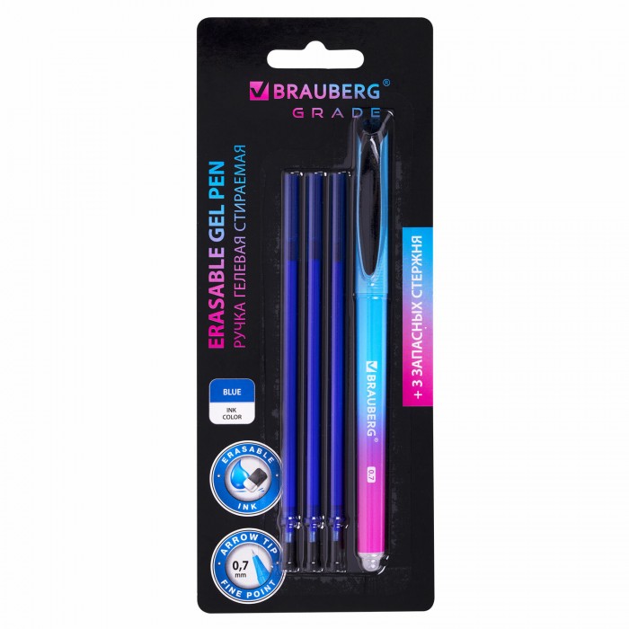 Ручка стираемая гелевая BRAUBERG "Grade", СИНЯЯ, 3 сменных стержня, узел 0,7 мм, линия письма 0,5 мм, 144209