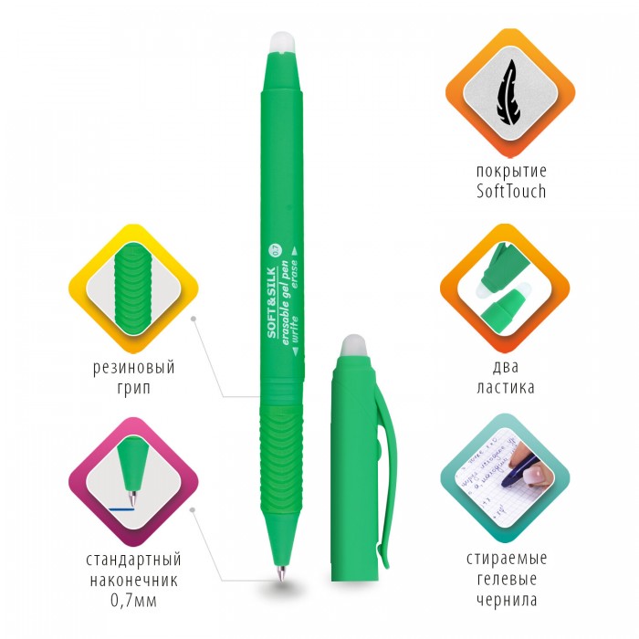 Стираемая гелевая ручка BRAUBERG "SOFT&SILK FRUITY" с покрытием soft-touch. Обладает уникальным сочетанием ярких обесцвечивающихся термочернил, стильного яркого дизайна и высочайшего качества исполнения.