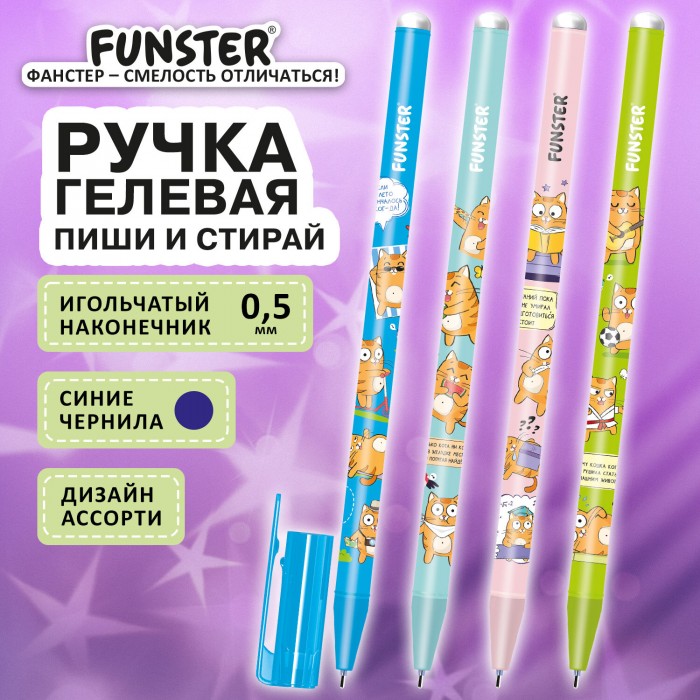 Стираемая гелевая ручка FUNSTER "КОТ-ЭНТУЗИАСТ" - универсальный помощник для ведения аккуратных записей за счет обесцвечивающихся термочернил и специального ластика, позволяющего вносить корректировки в текст сразу после написания.