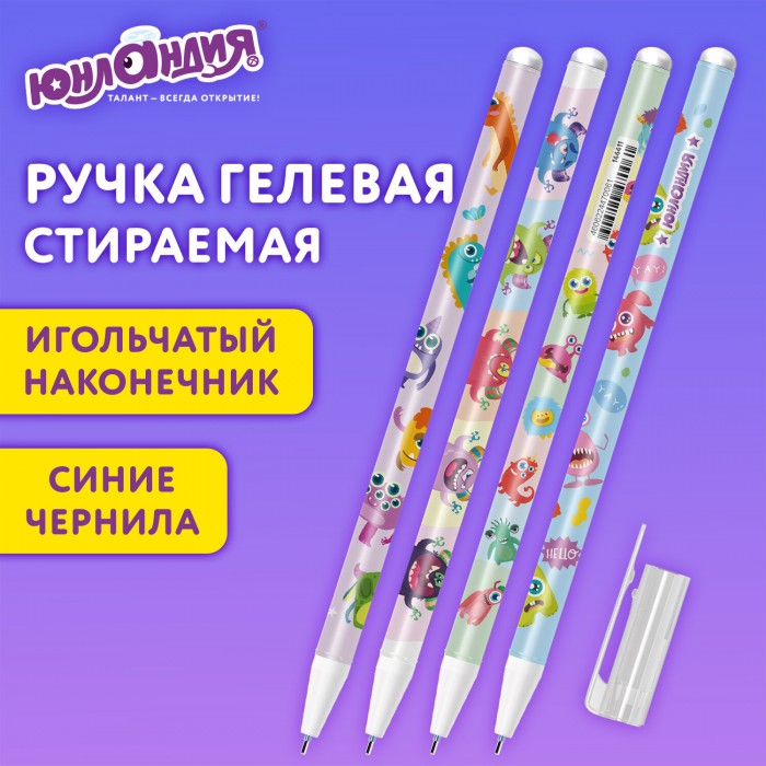Стираемая гелевая ручка ЮНЛАНДИЯ "МОНСТРИКИ" пользуется популярностью у младших школьников, т.к. помогает поддерживать чистоту в тетрадях: стираемые чернила позволяют писать аккуратно и без помарок, моментально внося корректировки в текст после написания.