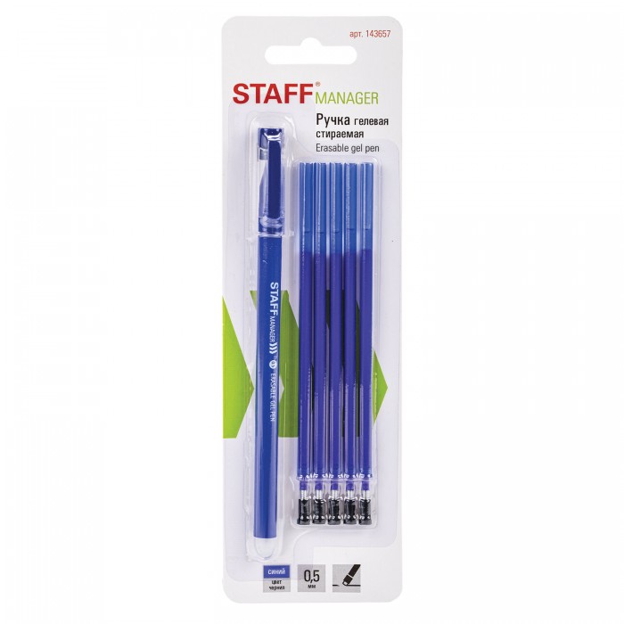Ручка стираемая гелевая STAFF "Manager" EGP-656, СИНЯЯ, + 5 сменных стержней, линия письма 0,35 мм, 143657