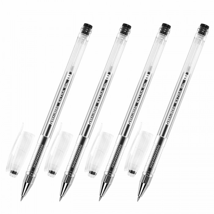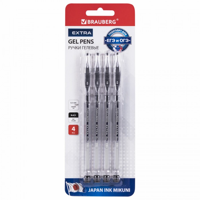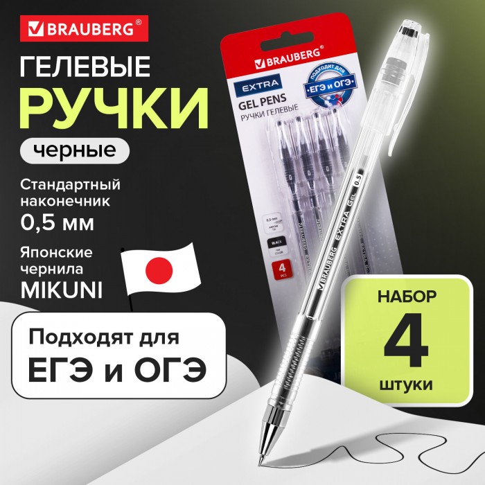 Ручки гелевые BRAUBERG "EXTRA", ЧЕРНЫЕ, НАБОР 4 штуки, узел 0,5 мм, линия 0,35 мм, 143906