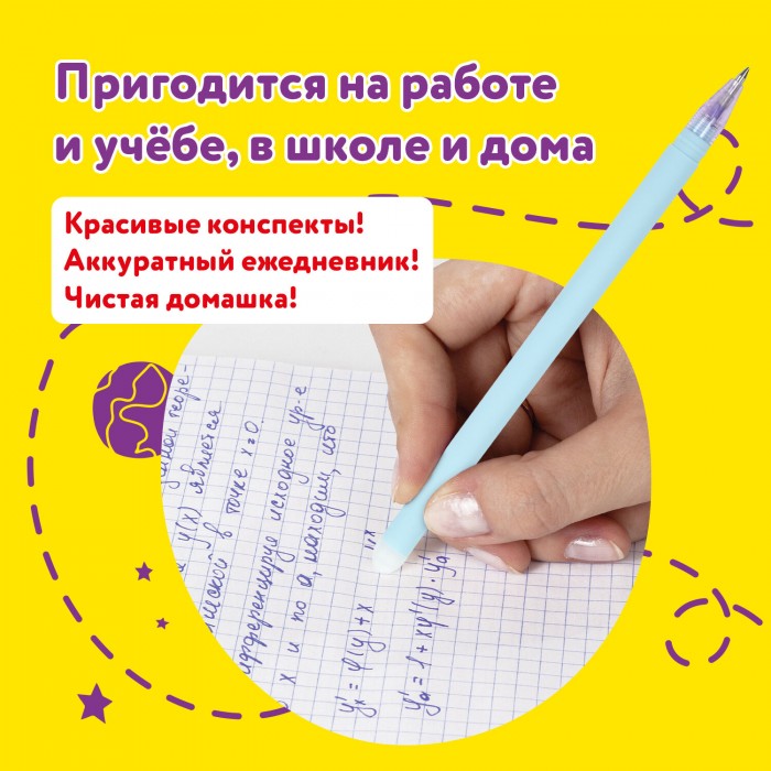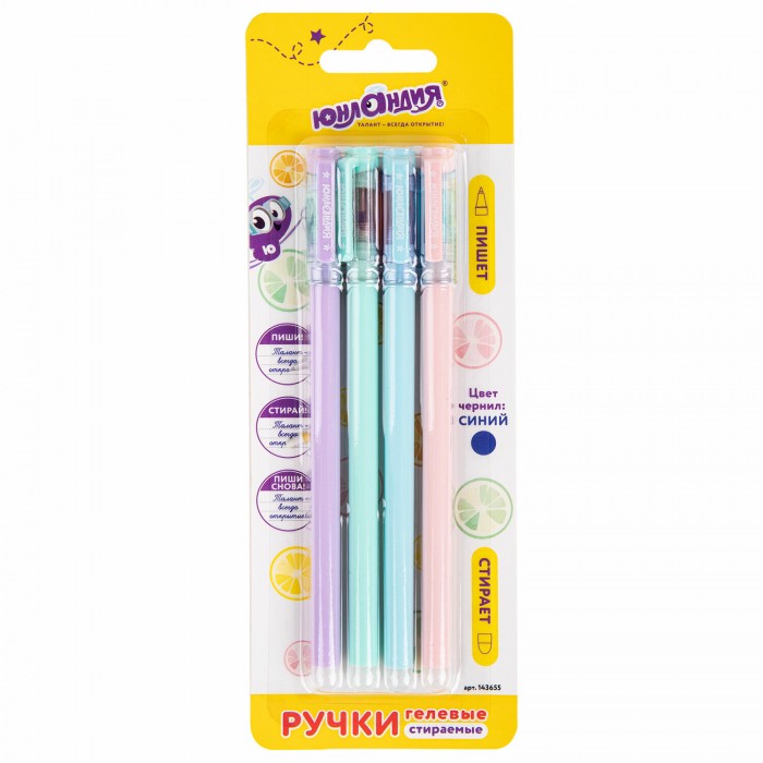 Набор гелевых стираемых ручек ЮНЛАНДИЯ "Лимонад" с удобным прорезиненным корпусом (soft-touch). Ручки пишут специальными гелевыми чернилами, которые становятся невидимыми при нагревании. Нагрев достигается ластиком, встроенным в корпус ручки.