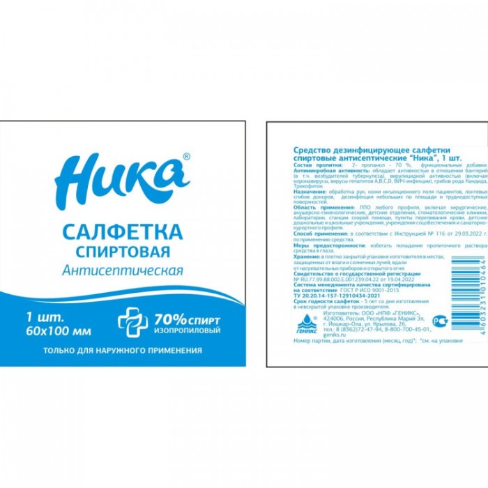 Салфетки спиртовые антисептические «Ника» в индивидуальной упаковке