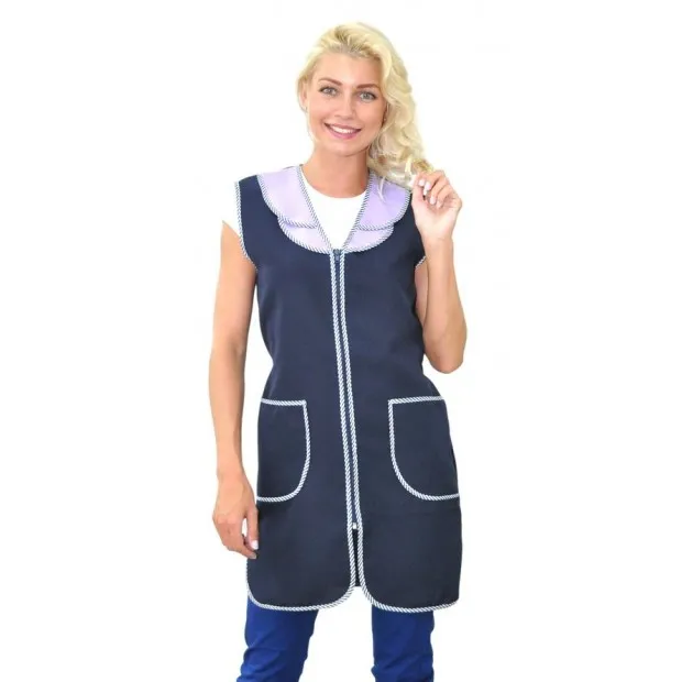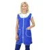 Сарафан женский укороченный прямого силуэта с центральной застежкой на молнию. Фигурный полуворотник выполнен из ткани контрастного цвета. В нижней части полочек расположены два вместительных боковых кармана. Спинка без отделки, объем талии регулируется полупоясами. Все детали сарафана обработаны кантом из капроновой ткани. Для увеличения прочности сарафана выполнено дополнительное усиление швов центральной застежки. Сарафан предназначен для защиты от общепроизводственных загрязнений.
