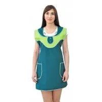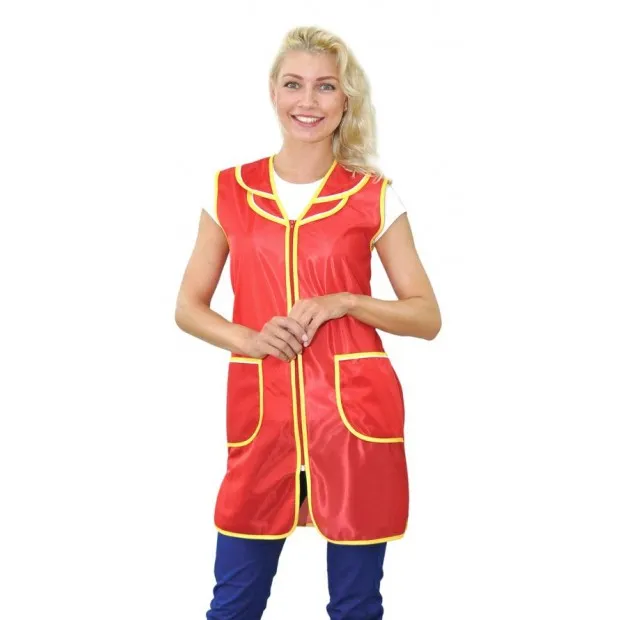 Сарафан женский укороченный прямого силуэта с центральной застежкой на молнию и горловиной с V-образным вырезом. Верхний срез боковых карманов и фигурные полуворотники декорированы контрастным кантом. Спинка без отделки, объем талии регулируется полупоясами. Все срезы сарафана обработаны износостойким нейлоновым кантом. Сарафан предназначен для защиты от общепроизводственных загрязнений.