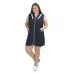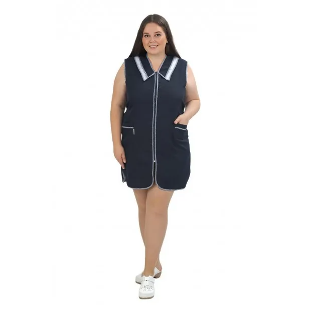 Сарафан женский укороченный прямого силуэта с центральной застежкой на молнию, с двумя нижними боковыми карманами и разрезами по боковым швам. Нижний слой полуворотника выполнен из контрастной ткани. Спинка без отделки, объем талии регулируется двумя завязывающими полупоясами. Все срезы сарафана обработаны кантом из контрастной капроновой ткани. Для увеличения прочности сарафана выполнено дополнительное усиление швов центральной застежки и карманов. Сарафан предназначен для защиты от общепроизводственных загрязнений.