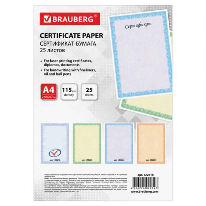 Сертификат-бумага для лазерной печати BRAUBERG предназначена для изготовления сертификатов, грамот, дипломов, памятных и других важных документов. Идеальна для письма масляными, капиллярными и шариковыми ручками.