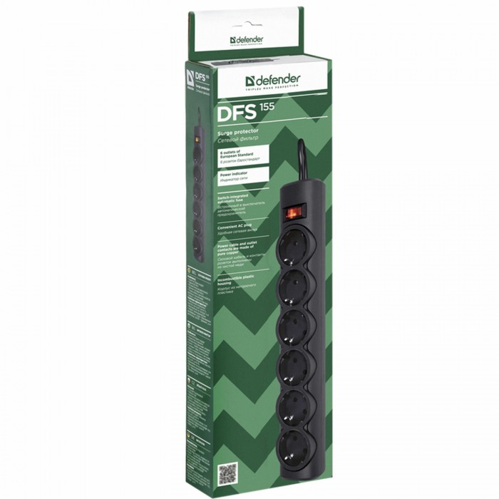 Сетевой фильтр DEFENDER DFS 155, 6 розеток, 5 м, черный, 99496